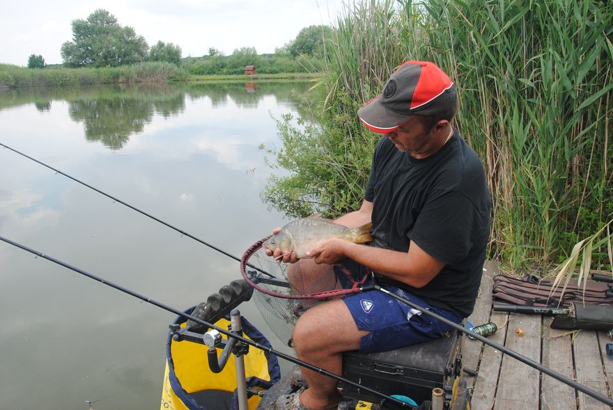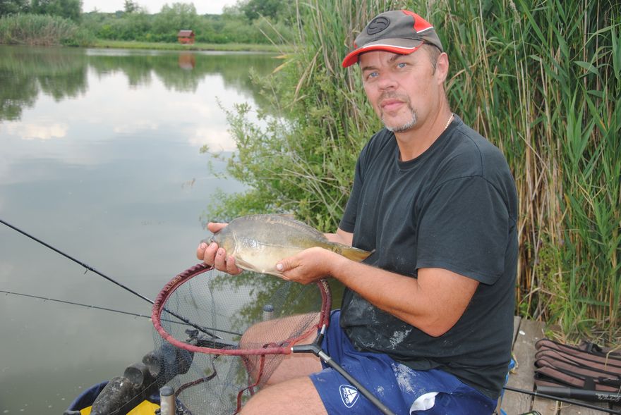 Most is fáraszt egy pontyot, felhúzza benyúl érte a szákkal, nem szabad segítenem és már parton is a potyesz, aztán ismétli sokszor még ma, ja bizony megy ez..