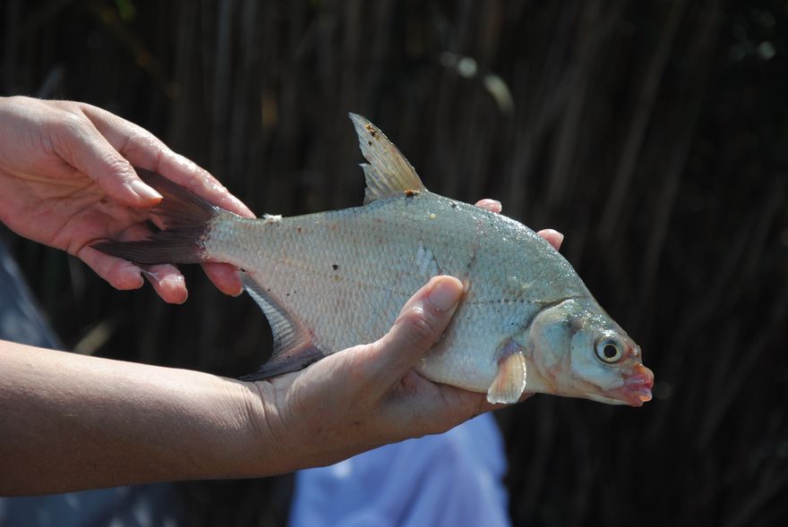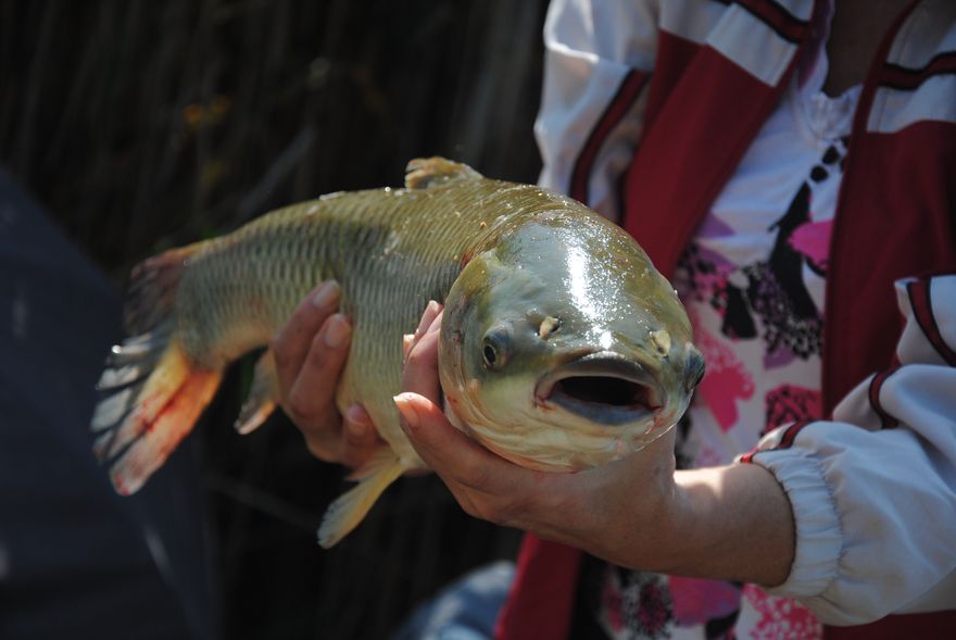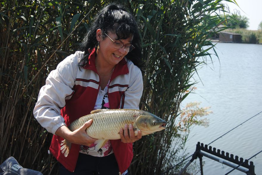 Van egy ötletem és el is mondom Ildinek, miszerint csak így oldalra balra nád elé pár méterre erjesztett kukoricával dobjon be a 3 méteres kis finom picker bottal, hátha lesz egy meglepetés halunk, megesik az néha… És igen, bejött az ötlet a kisbot elgörbül Ildi bevág majd ellazul a zsinór mert a hal berohan a lábunk elé, nincs idő gondolkodni ösztönösen a felkapott szákkal villámgyorsan szákolom az amurt!!! Nagy az öröm, Ildi élete első amurja parton, örömpeca a köbön!!