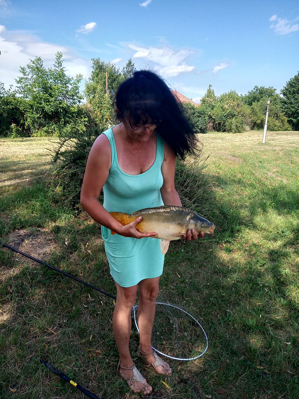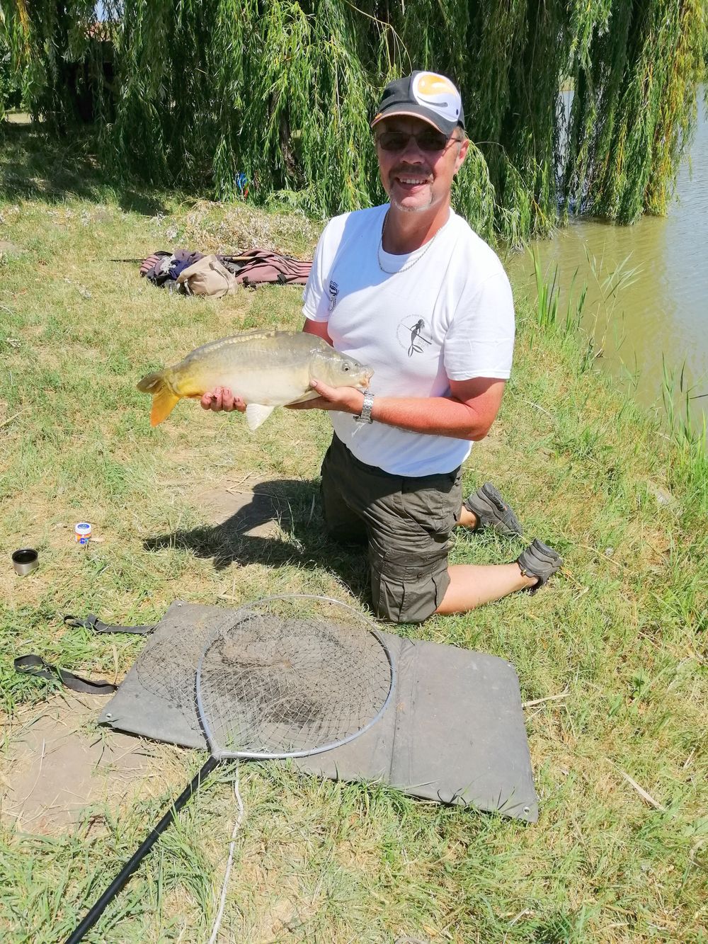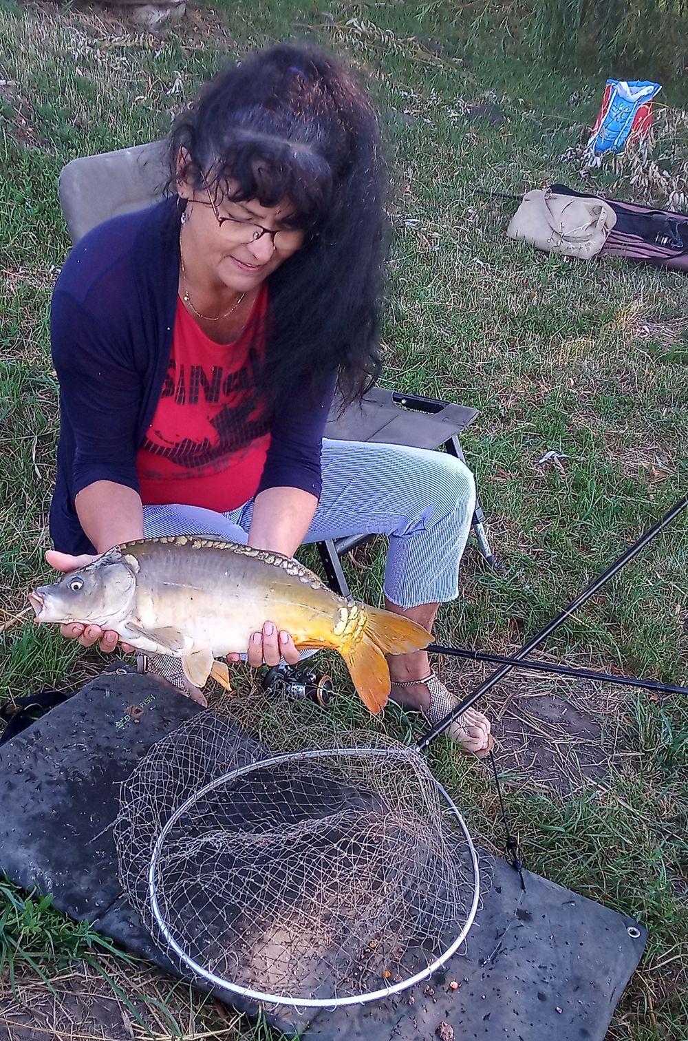 Néha átmegyek fotózni egy-egy halát Ildiknek, de mielőtt átnéznék a szomszédhoz kiengedem a féket, bár csak ide dobtam a versenyláda elé. Megbeszéljük a fogásokat, egy kis szakmai tanácskozás az etetőanyag használatának módjáról majd sétálok vissza, de úgy forog az orsó fékje hogy nem győzöm megkeresni a halat hova is vándorolt el a Daru tóba? Nevetem, mindenhogy és mindenhol kap a ponty így estefelé összepakolás közben is…