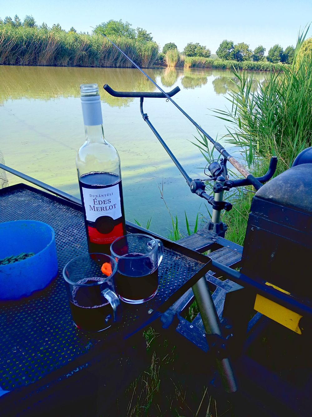 Mivel Ildi még csak most ismerkedett meg a Daru tóval, a megismerkedés is csak versenykörülmények között volt, így ideje folytatni ugyanitt a horgászatot, most épp egy Csaba napot megtartva. Még otthon összeállítottam a „rendezvény menüjét”: szalonna, hagyma, kolbász, kenyér, bor (Merlot) ez 20 másodperc alatt meg is volt, tehát indulhatunk.