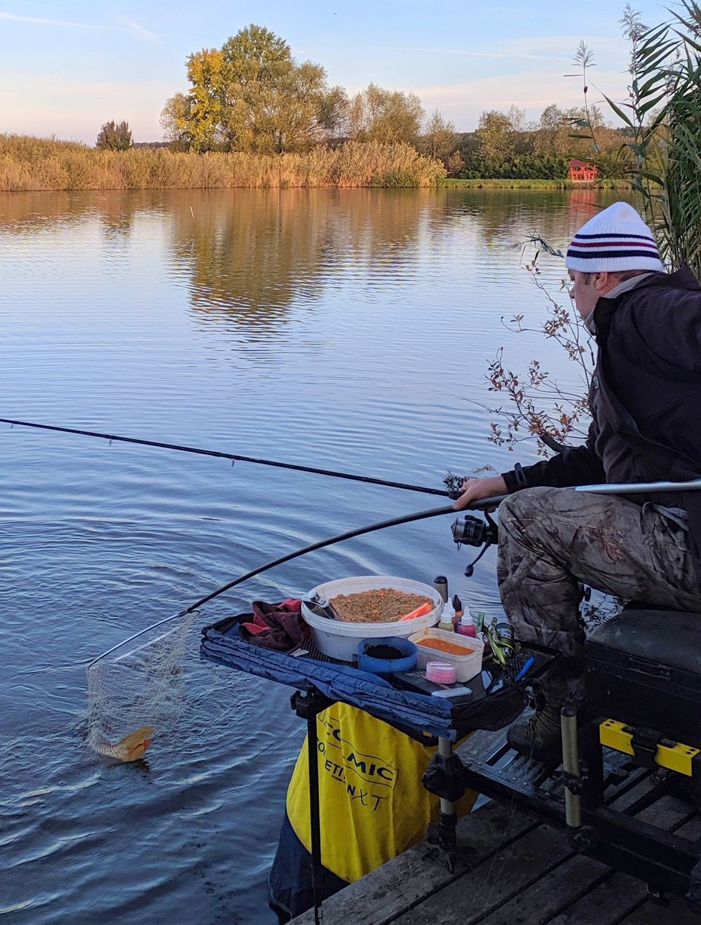 Egy hosszúelőkés cuccal etetek, szépen pontosan minden dobás ugyanoda egy olyan húsz méteres távot választottam. Gilisztacsokor felrakva, erőgumi beépítve a szerkóba, meglepetés nem érhet. Na lássuk a másik botot, akkor egy method kosaras felszerelés és szeder pellettel kezdünk, egy csepp krill aromával bolondítva, hátha…