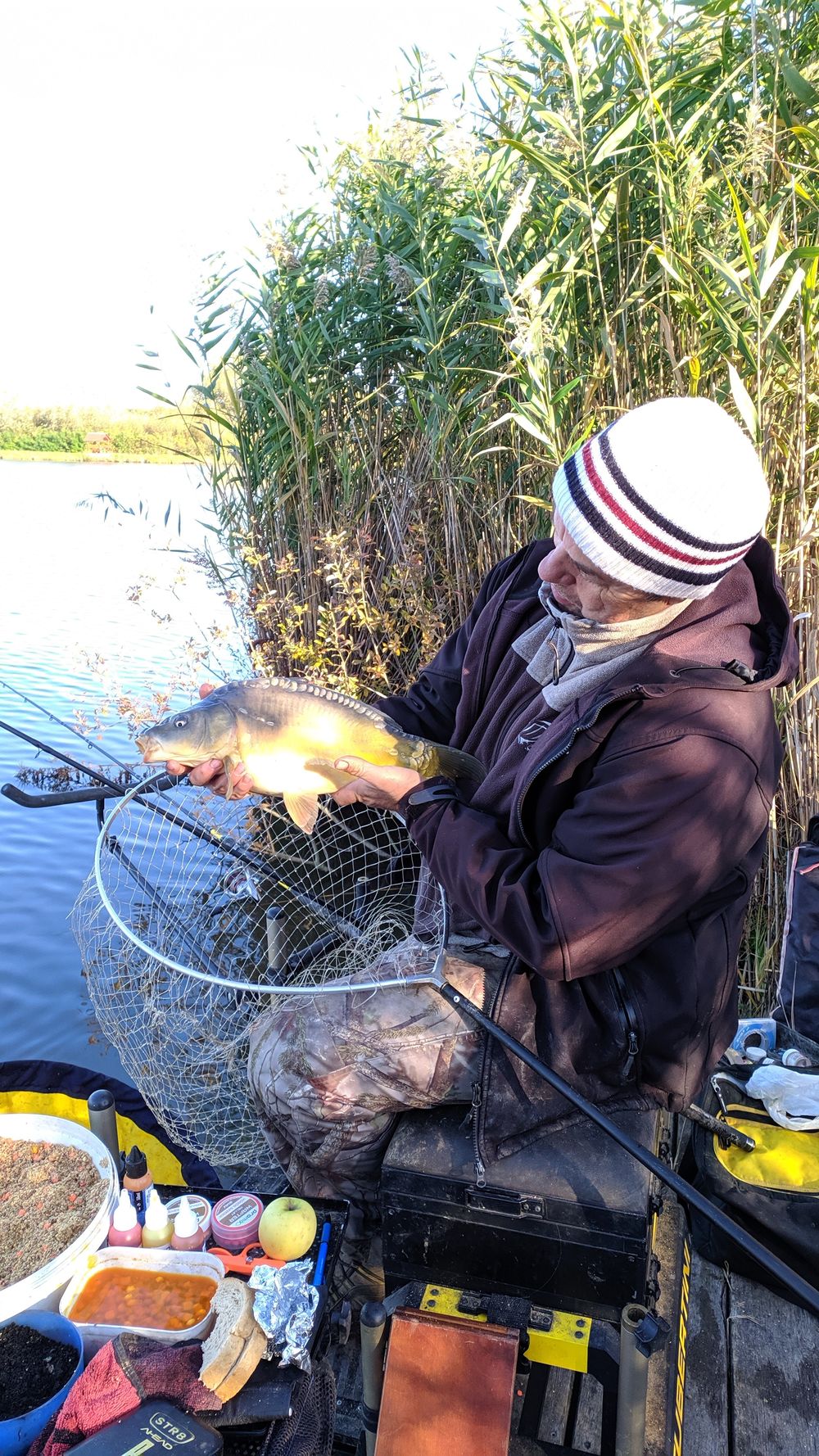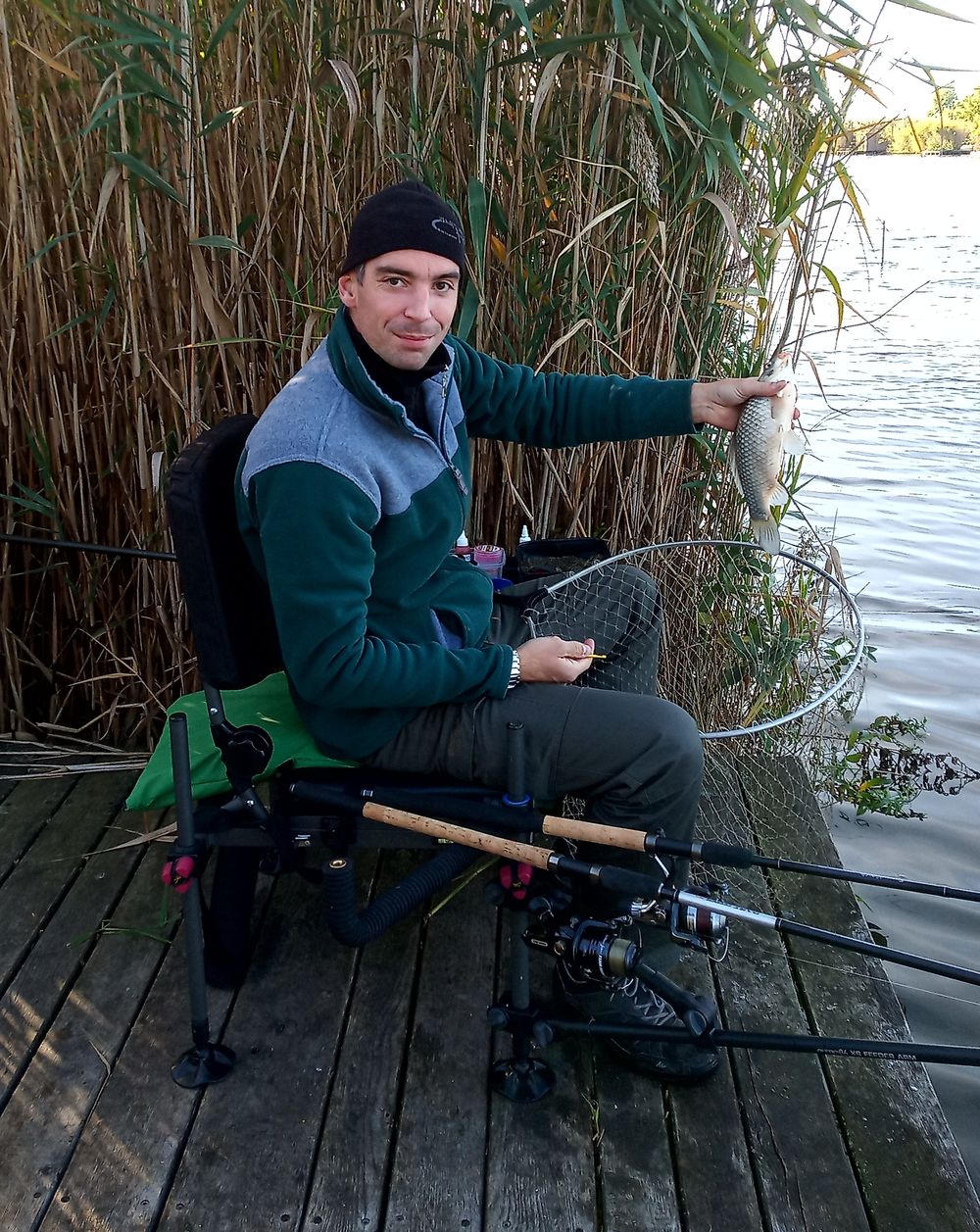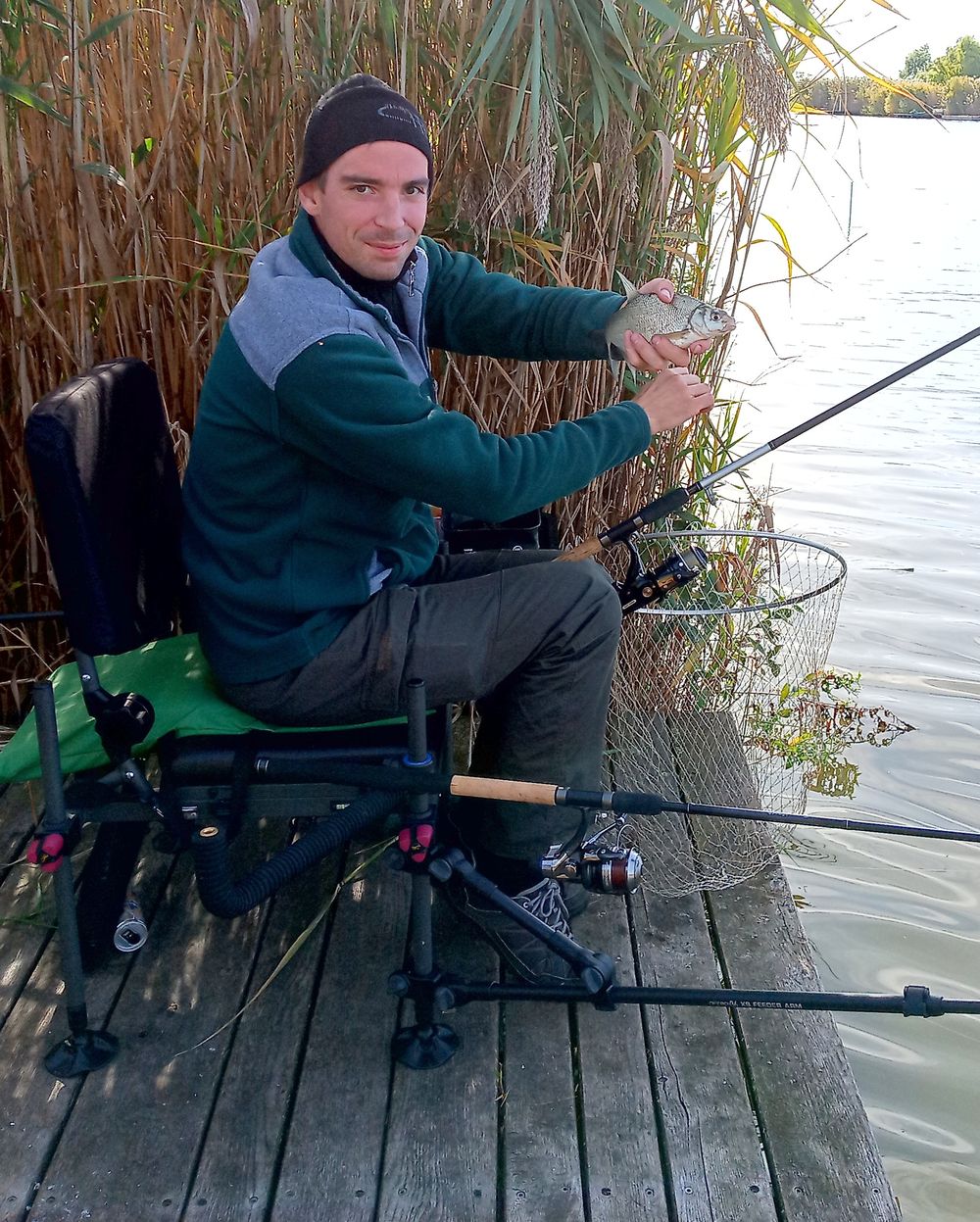 Most a methodos boton van soron hisz bekaszál félreérthetetlenül, de nem nagyon értem a dolgot nem hagyja magát a hal, sokadjára sem engedelmeskedik nekem csak a megbízható első fék kattog megnyugtatóan, tudva tudván a felszerelés hibátlan, nekem kell tudást párosítanom hozzá. Közelít már a stéghez, jó nagy szája van amint kortyolja a kábulást okozó levegőt. Elsőre nem sikerül megszákolni, másodjára kifordul a szákfejből, harmadjára van benne csak, ez kemény menet volt és gyönyörű a hal, örülök.. Fáradtan elúszik, azt hiszem ilyen kellemes hideg reggelem még nem volt idén…