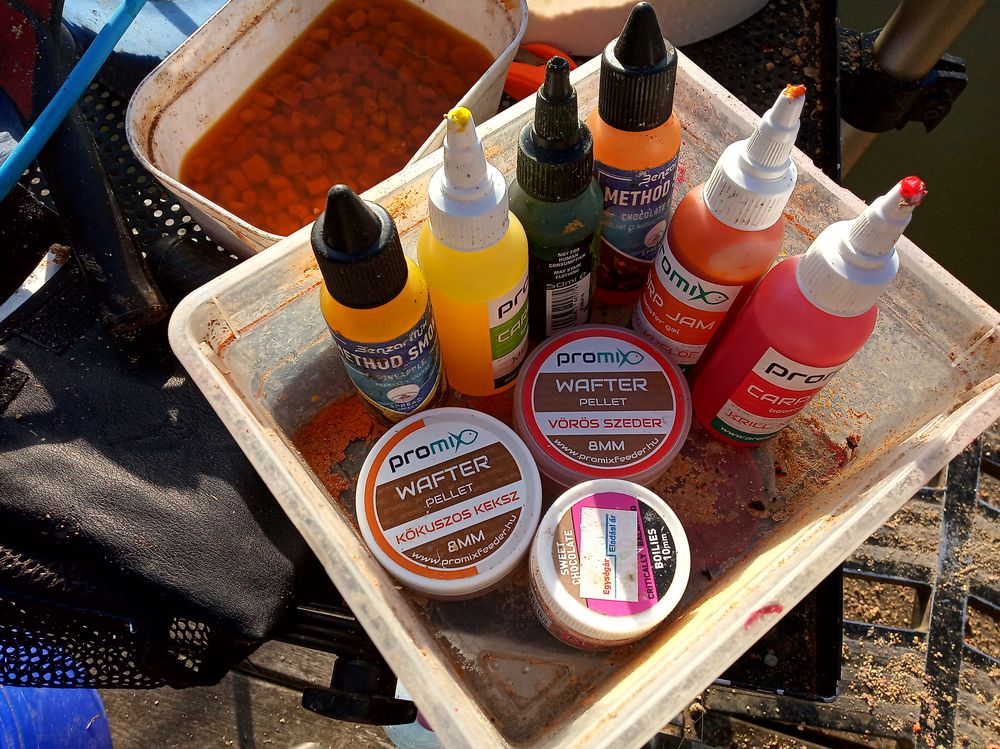 Tibi kollégám már ott vár a földúton, pontos mint a nürnbergi toronyóra, ma együtt horgászunk, de majd meglátogat bennünket Frici is úgy hogy olyan barátok közti peca lesz. Gyorsan partra kerül a láda, az etetőanyag már jó is, az új pellet arzenál próbára kész egy csomó sűrű aromával együtt, most megtudhatjuk mire képes egy bizonyos márka, bár ha Novák János elméjéből fakadt, minek izgulok csak semmi pánik, ma Promix-el horgászunk..