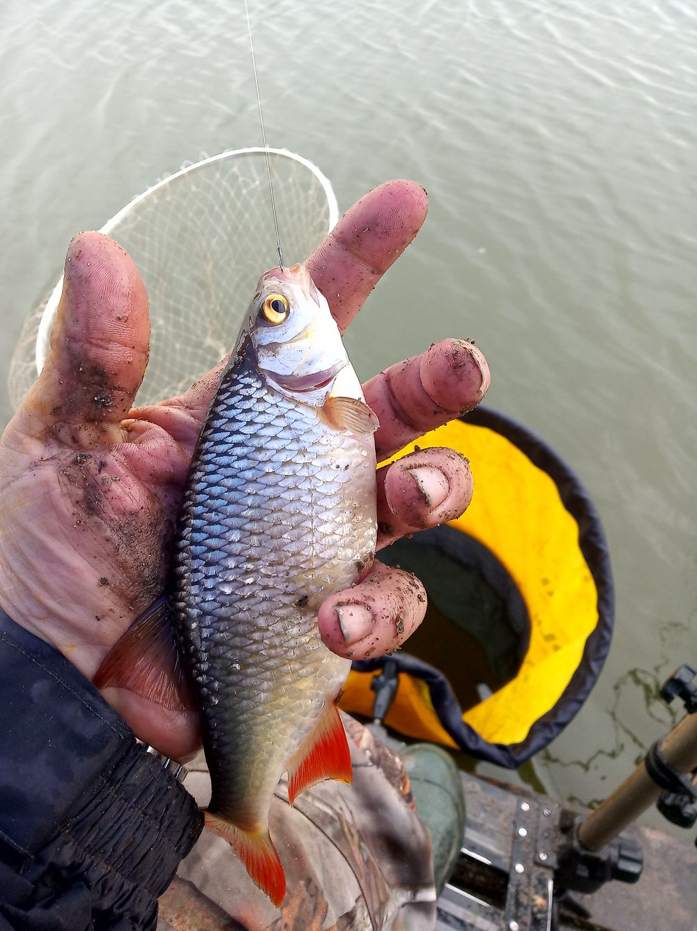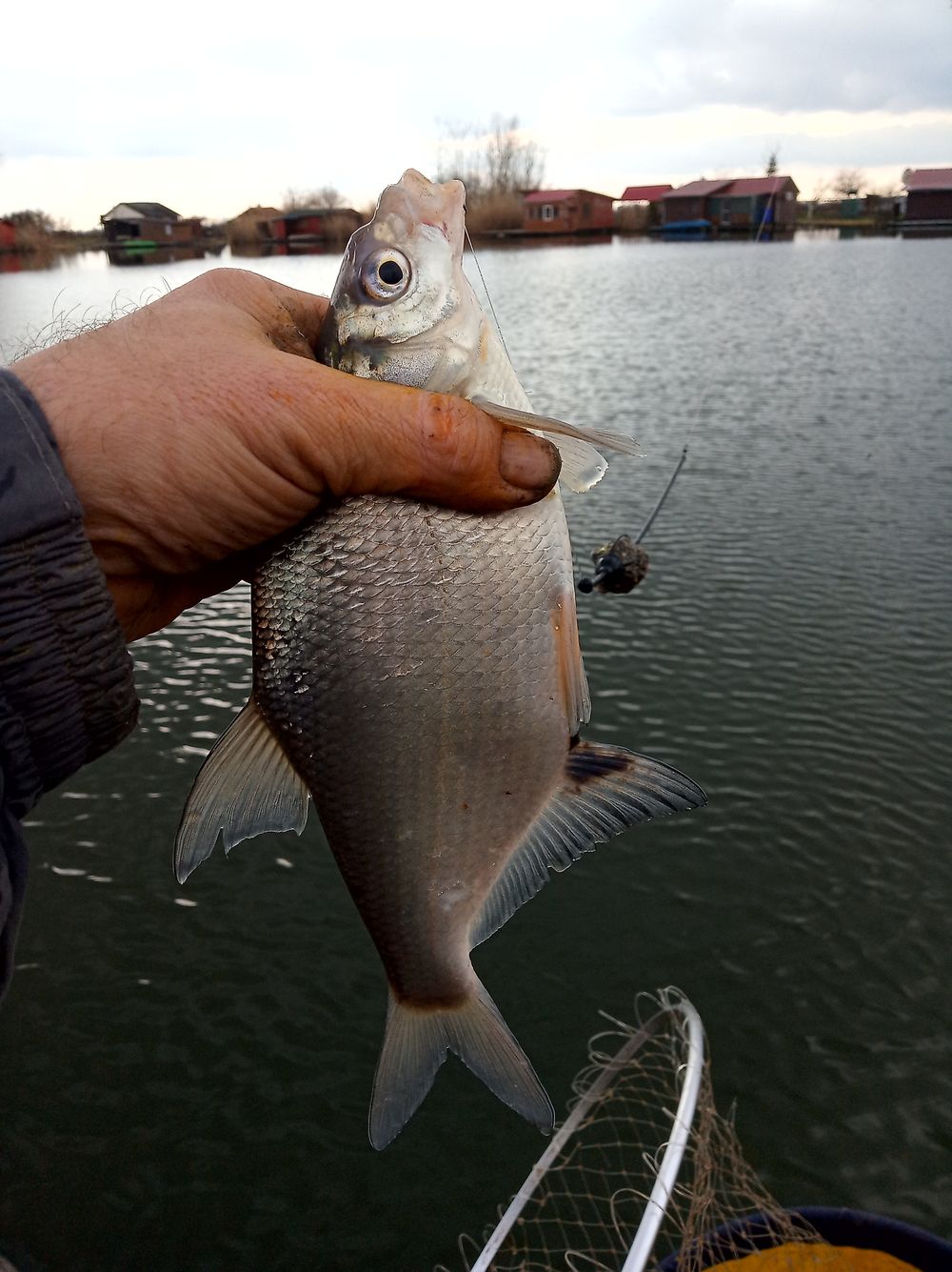 Lassan pakolnom kéne, átfagytam, áztam, derekam is beállt valamilyen ismeretlen oknál fogva (ernyő alól kihajolva dobni „derekas” munka). Belazul az elpakolandó botom és refelexszerűen bevágok és csodaszép kárászt fárasztok, de mivel már a szákot is elpakoltam így kézzel veszem ki.