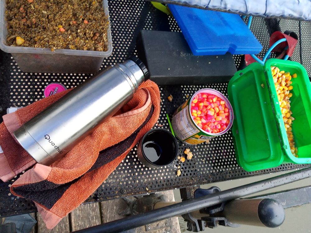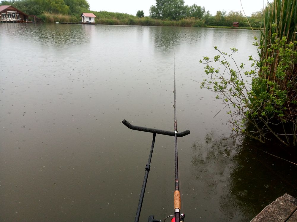 Ez pontosan ki lett számolva időre, a vízmentes nagytáskát verheti az eső a többi dolog az ernyő alatt lapul és már a rakót tolom is befelé mélységmérés céljából. Érezhetően áramlik is a víz, kicsit nagyobb úszó szükséges szokottnál, de pontyozni jöttem szóval mozdulatlan csali szükséges ma. Jobbra nádfal előtt egy komoly nehéz feeder bot tejsavas kukoricával, a rakós az pedig csemegével üzemel egyelőre. A nehéz feeder elhajlik egy pillanatra halam van, de hamar lefordul. Szidom magam azért, egy szép karcsú lightos botom ilyenkor karikába ugrik, de ez a heavy feeder leszórja a halat.