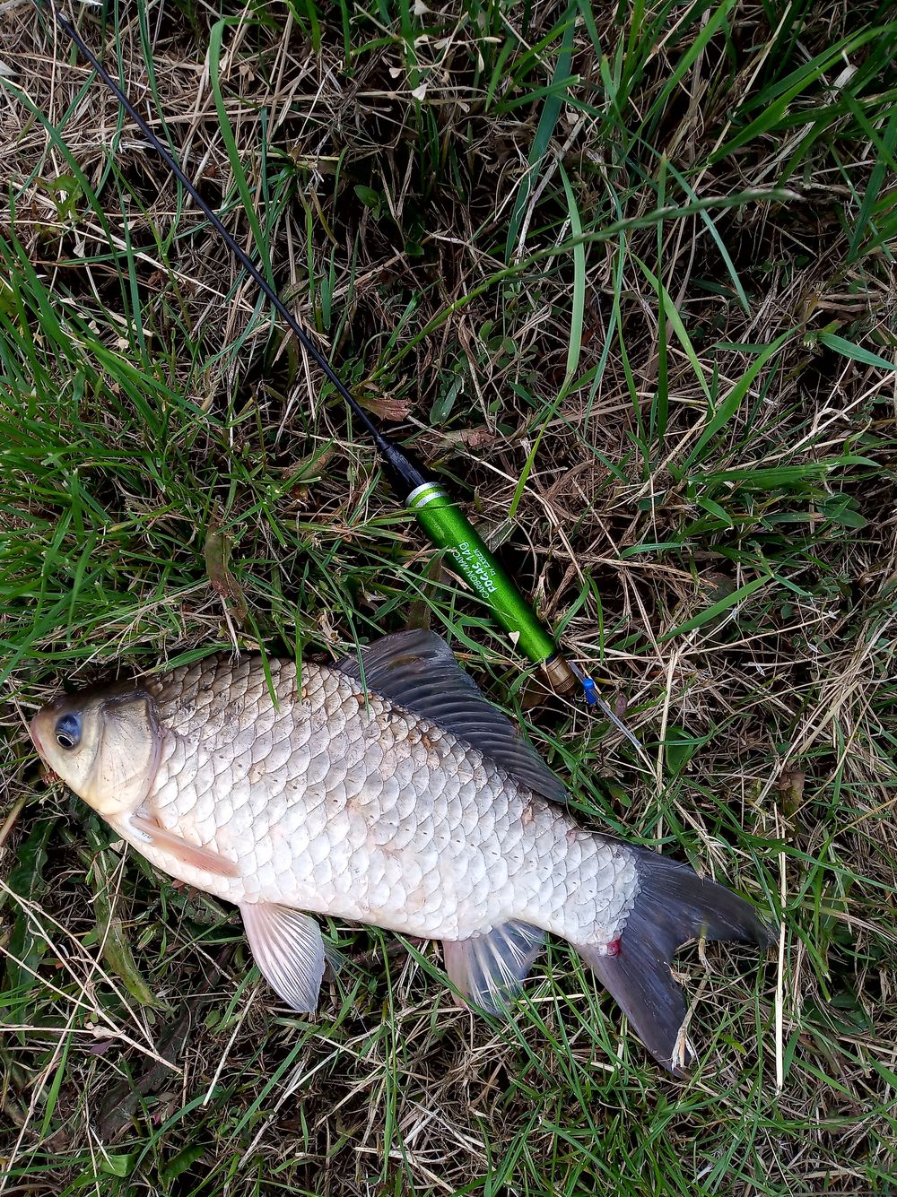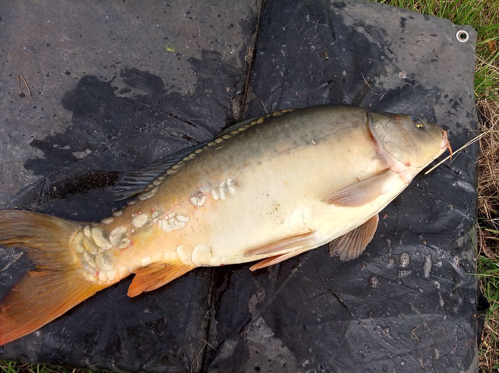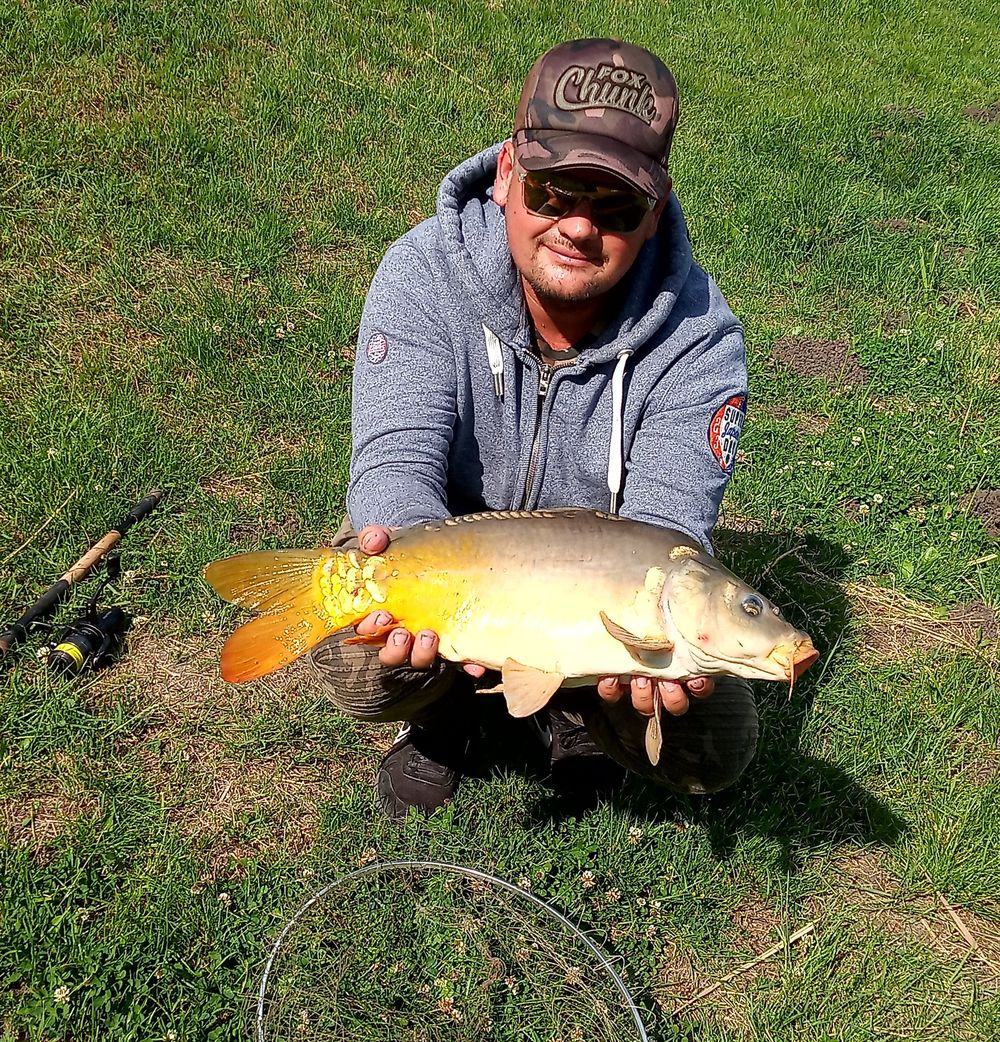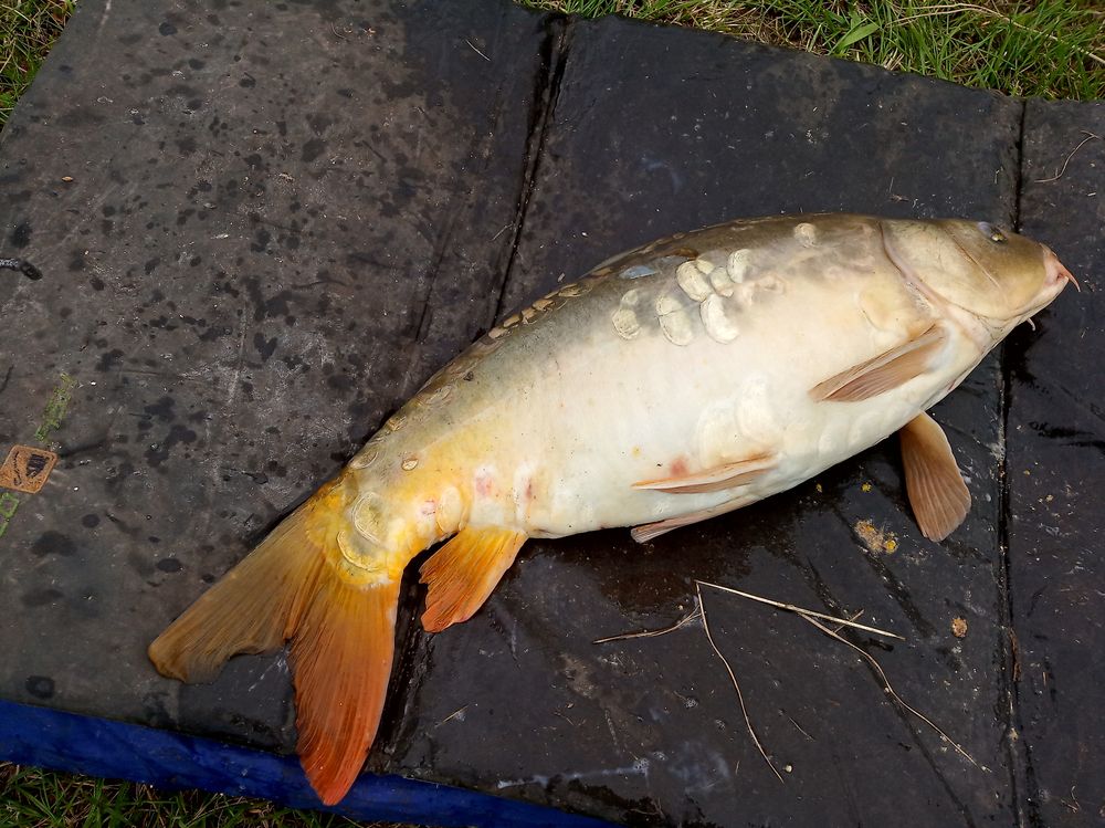 Derekas egy pikkelyes pontyot fárasztok nem adja meg magát semmi pénzért sem és lassan én fáradok, bár jobb lesz türelemmel kivárni a sokadik kört és némi levegővel megkínálni.. Úgy is van végre szákban van, egész szép pikkelyes potyeszt fogtam, jól néz ki.