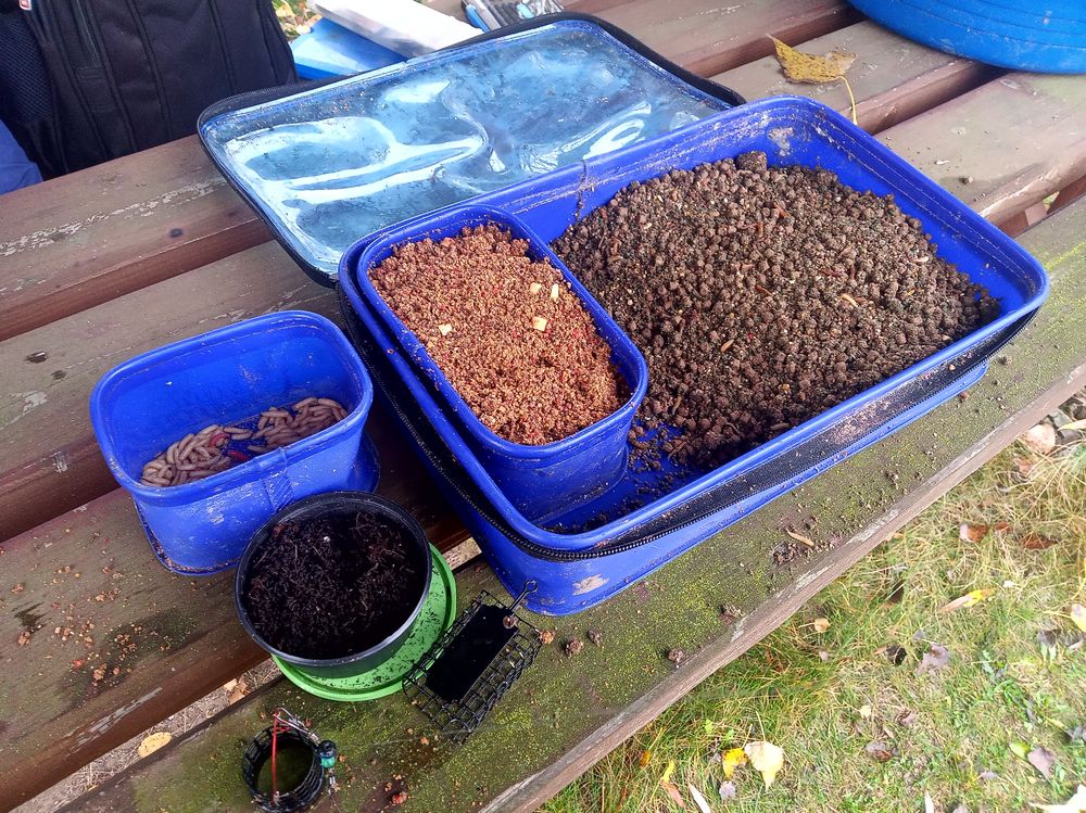 Szerencsére van filagória így bebújok az esőcseppek elől ide és összedobom a halaknak mára a menüt. Egy édes jellegű keszeges etetőm van és egy halas mikropelletes mix, az utóbbit method kosárba szánom, az édest hosszúelőkés szerelékre. Lássuk mi újság odalent, eső ide vagy oda halak etetés!!