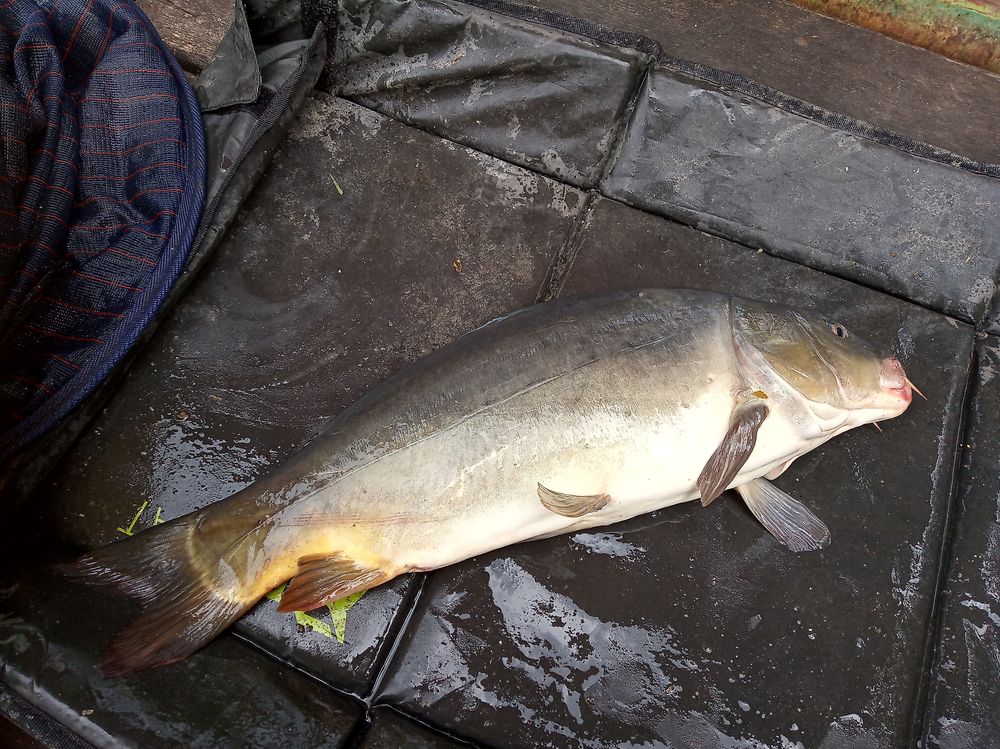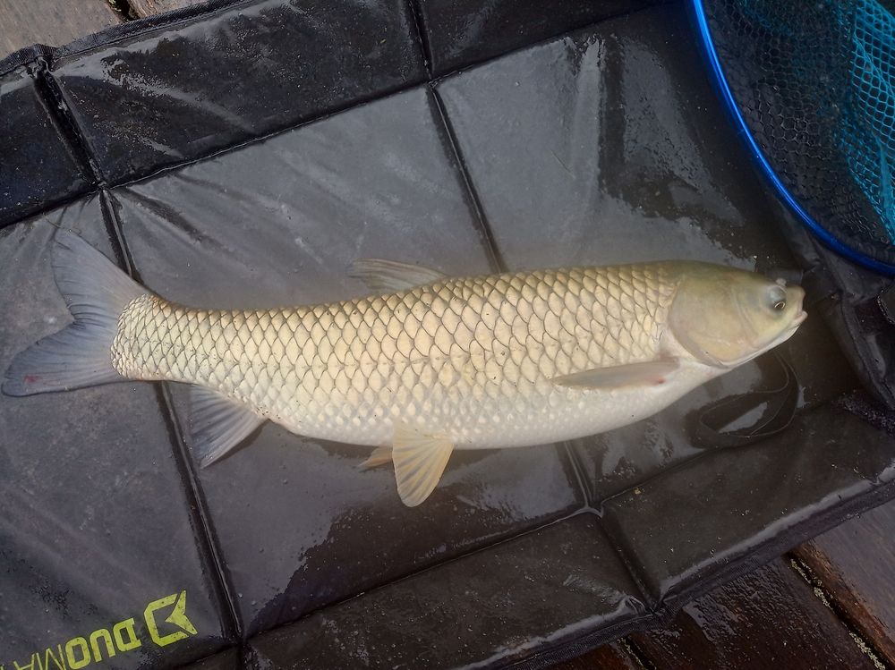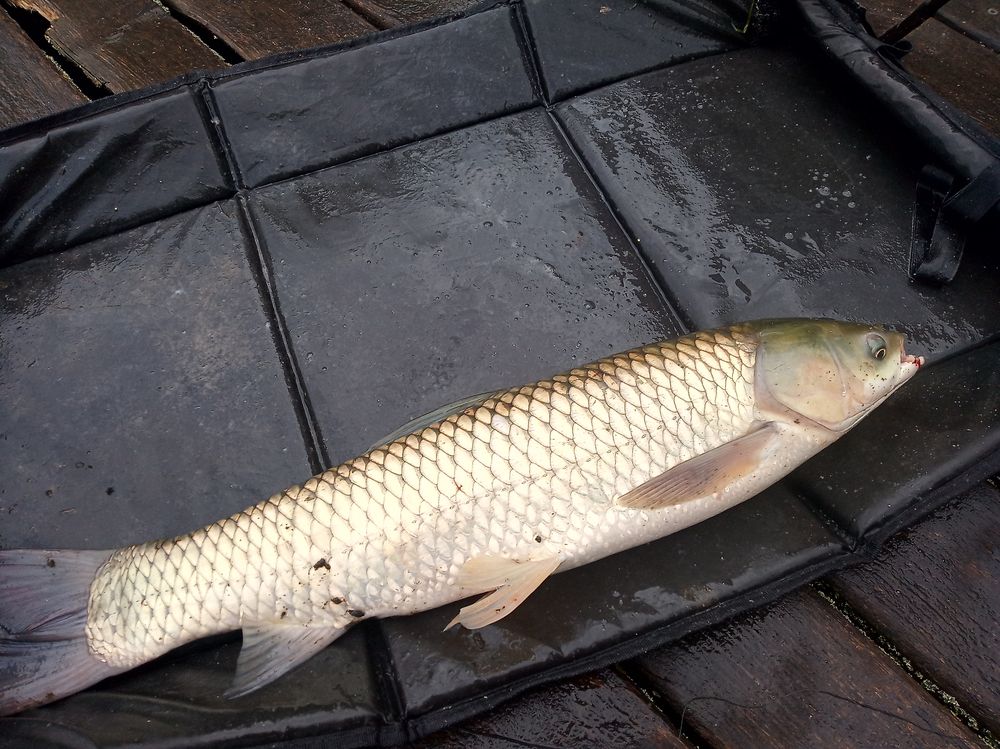 Hamarabb kaptam választ mint gondoltam, elhajlik a bot és a zsinór valahol az ágak közt cikázik, az amur mert az, engedelmesen kijön az akadóból követi a botom iránymutatásait, majd szákolom, ez gyorsan ment. Annál nehezebb lecsillapítani, a matracon megpróbál mindent széttörni és felborítani, fárasztás a parton birkózómeccs formájában!
