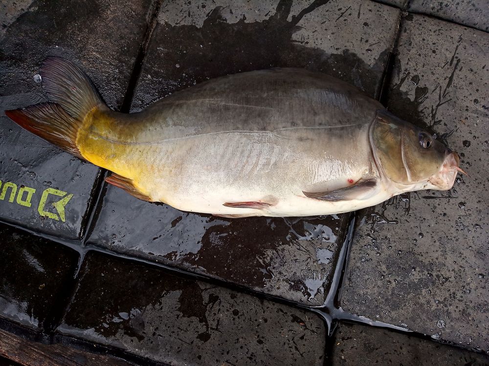 Nincs idő újra dobni, mert a másik bot is elfüstöl, újrafárasztás kérem ha egy üzlet beindul… Elég izmos szintén tükörponty a horgon, őt is szákolom és ezenközben esik és esik az eső, annyi változással hogy most már buborékos a víz az esőcseppektől.