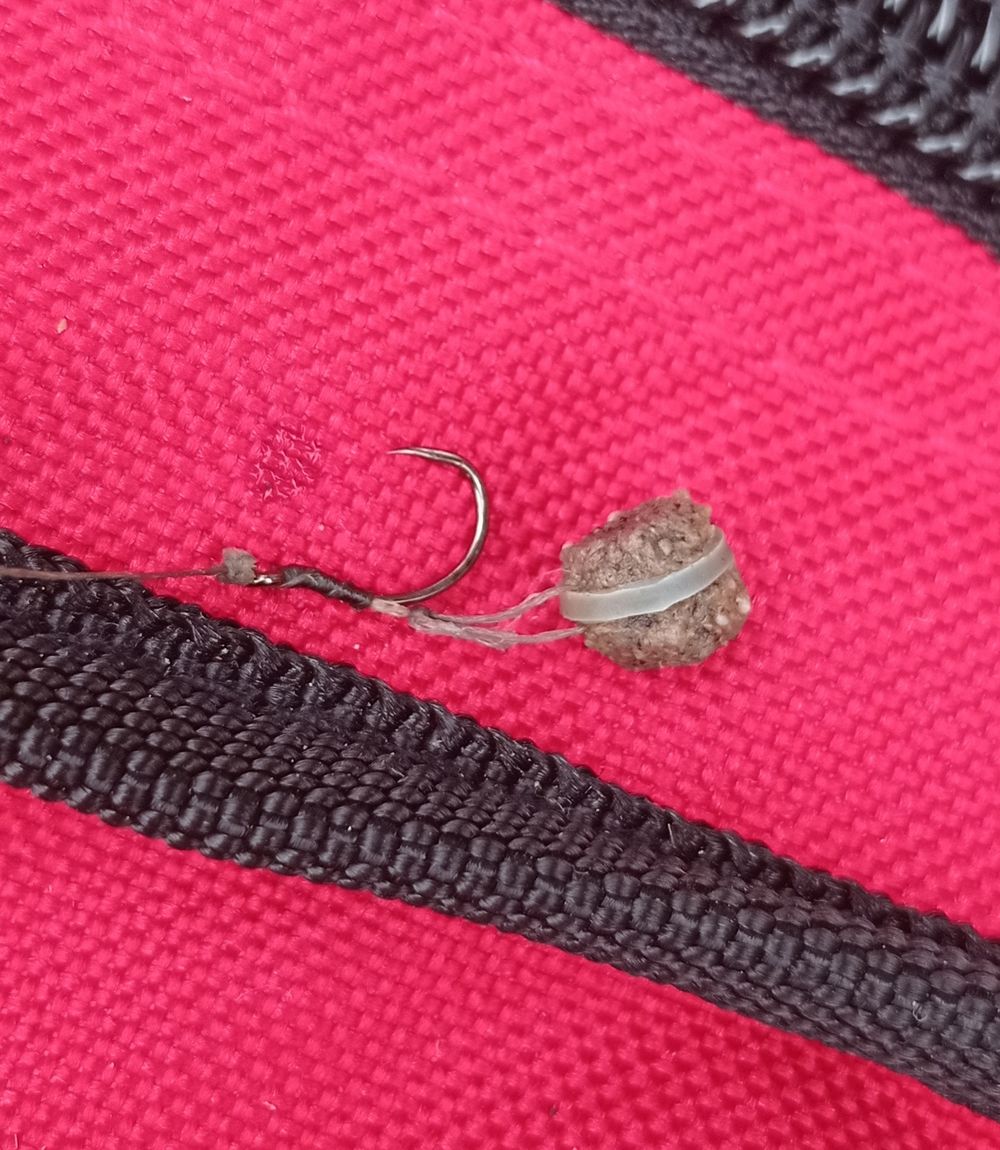 Bent van a kocsiban bontatlanul egy zacsi Aqua Garant uni 6 mm-es etetőpellet, próbáljuk meg azzal. Áztatgatom 5-10 percig, aztán egy formázható állagot felvesz, majd a felszerelésemről lecserélem az előkét és gumigyűrűs hajszálelőkét rakok fel, ebbe ugrasztom be a még száraz 6 mm-es uni pellet.