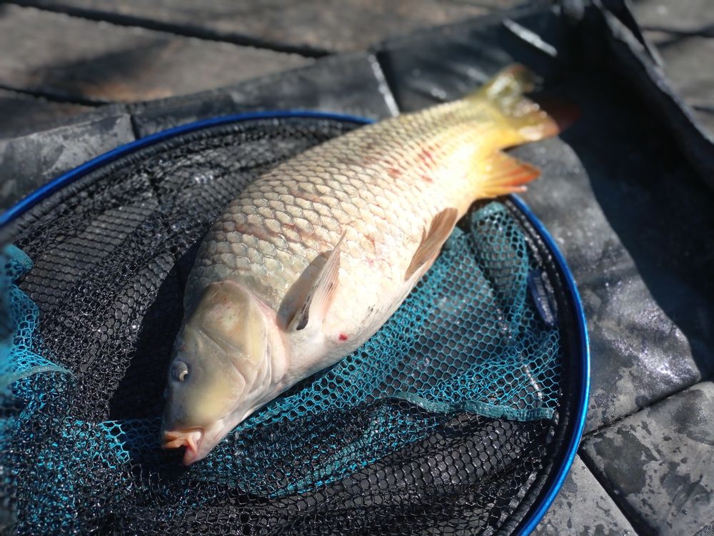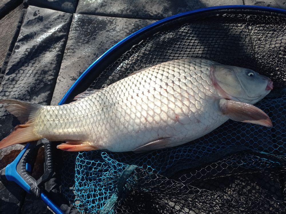 Közben a szomszédom is lesz, egy szimpatikus középkorú fiatalember aki szintén feederezik. Lecserélem a pinkit a horogról és fehér csonti megy rá szétnyomott kukoricával együtt, aminek aztán meg is lesz az eredménye mert elhajlik a botom vége. Pikkelyes pontyot fárasztok, ami ilyen vékony pálcával nagy élvezet és olyan mértékben hajlékony a botom, hogy egyetlen egy fékhang sem hangzik el, hanem ez a csodabot kidolgozza a hal erejét majd szákolok. Nocsak az első ponty nem is methodra jött, hanem hosszúelőkére.