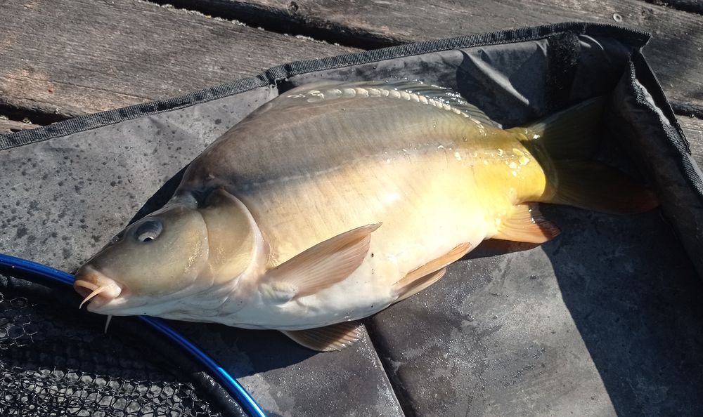 Igaza van a szomszédnak tényleg megint kapás, de most nem történik semmilyen amortizáció a felszereléssel, szép tükörpotyot fogok, derekasan megdolgoztatott. Nem sokat lehet gondolkodni, a másik bot is elhajlik, úgy látszik megvárta míg az előzőt kifogom, csak aztán kapott. Ez már egy kategóriával feljebb van, súlyban izgalmas fárasztás veszi kezdetét, ami szákolással zárul, egy kadarcsi pikkelyes…
