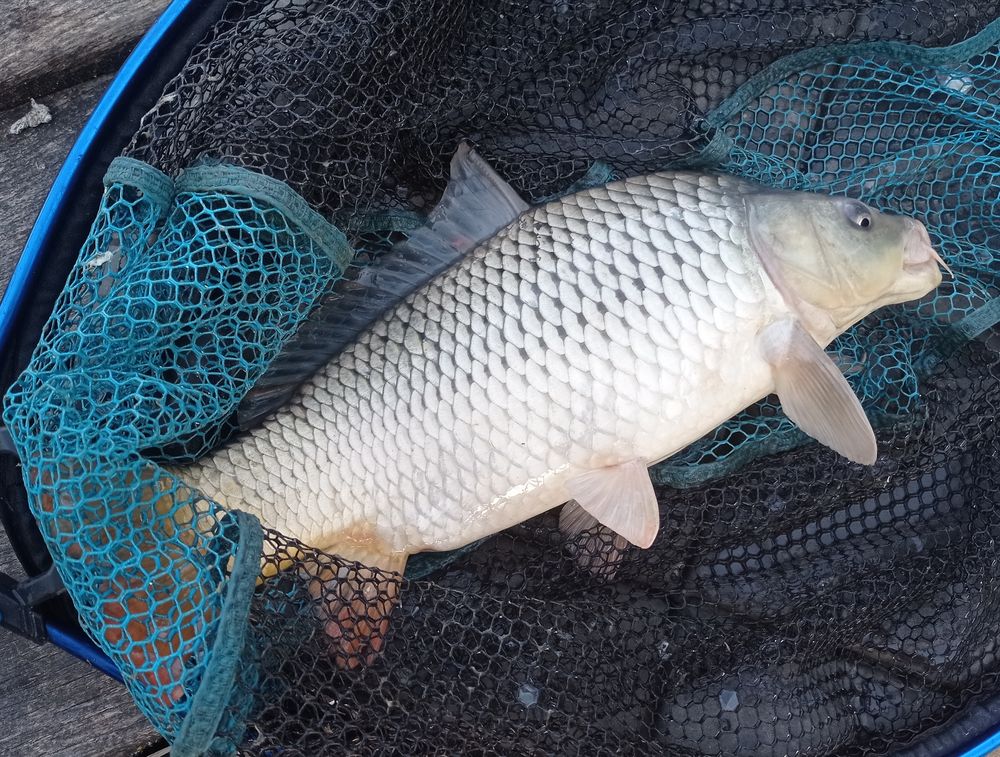 Jól kezdődik a reggel… Folytatom, amit elkezdtem bár az amuros ramazuri után egy kis csend következik. Egy keveset úszózok a nádszélben, de nincs kapás a part menti etetésen, majd visszanézek később. Most a távolabbi botom elkaszál és egy pikkelyes ponty volt a bűnös és szákolom is.