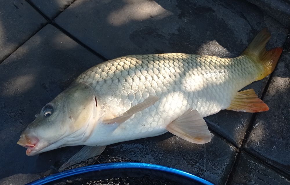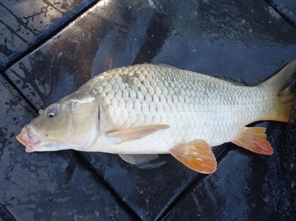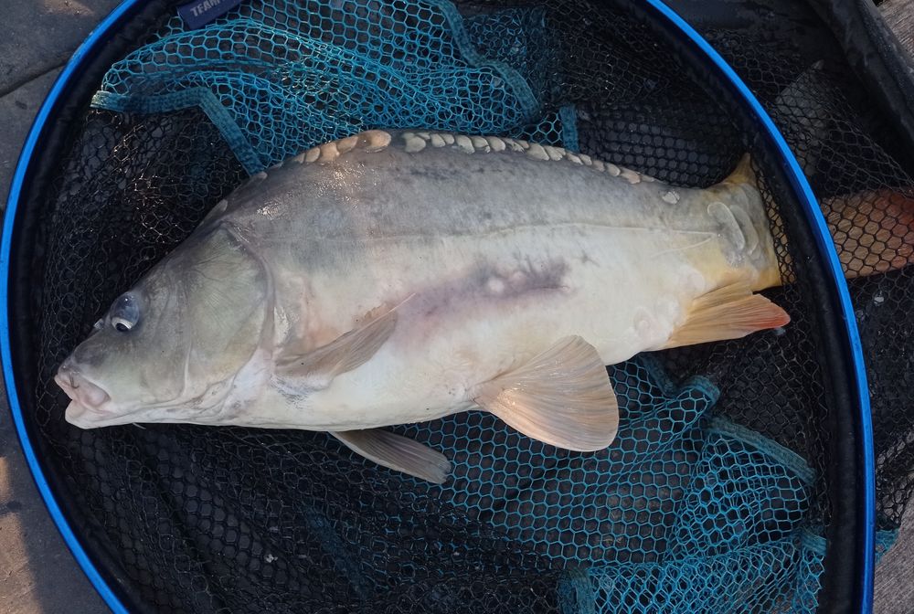 A következő ponty már megvan sikerül megfogni és örülünk mindketten, egy egész termetes tükörponty volt a tettes.