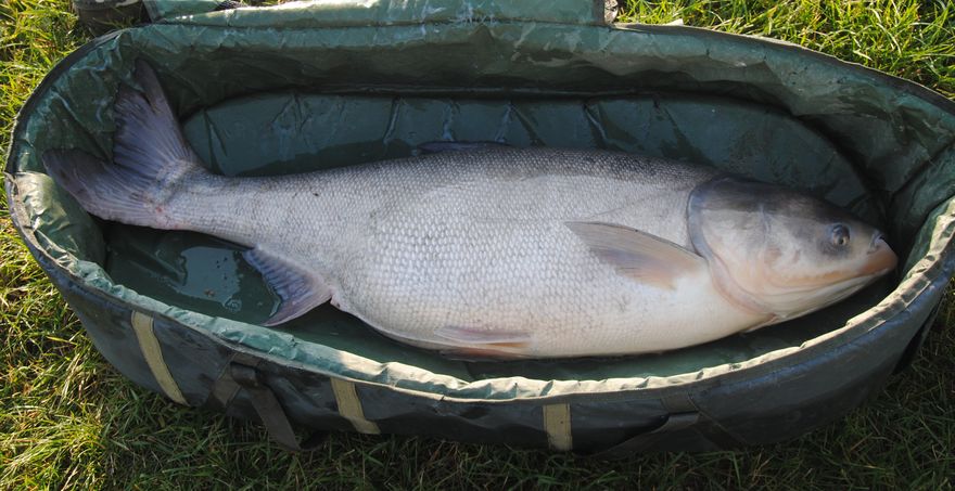 Ismerős érkezik hangtalanul csónakkal, perget láthatóan sikerrel, de nem kicsi hal lehet a horgon mert tolatásra kapcsolja a villanymotort és közelít a part felé segítséget kérni! Hatalmas busába akadt a pici műcsali, csoda hogy bírja a horog. Nagy nehezen ketten kivesszük Szabival és fotózhatom a jó 20 kilós busát!!!