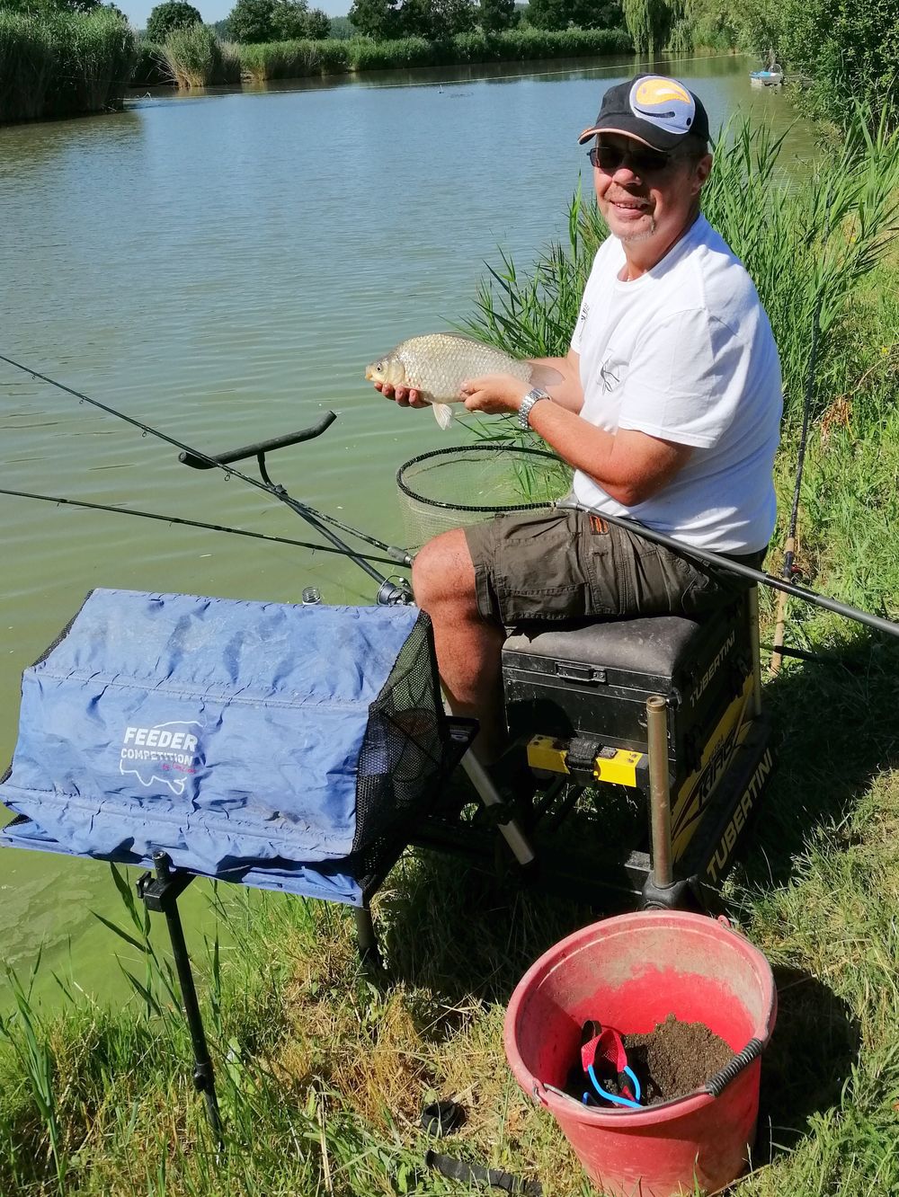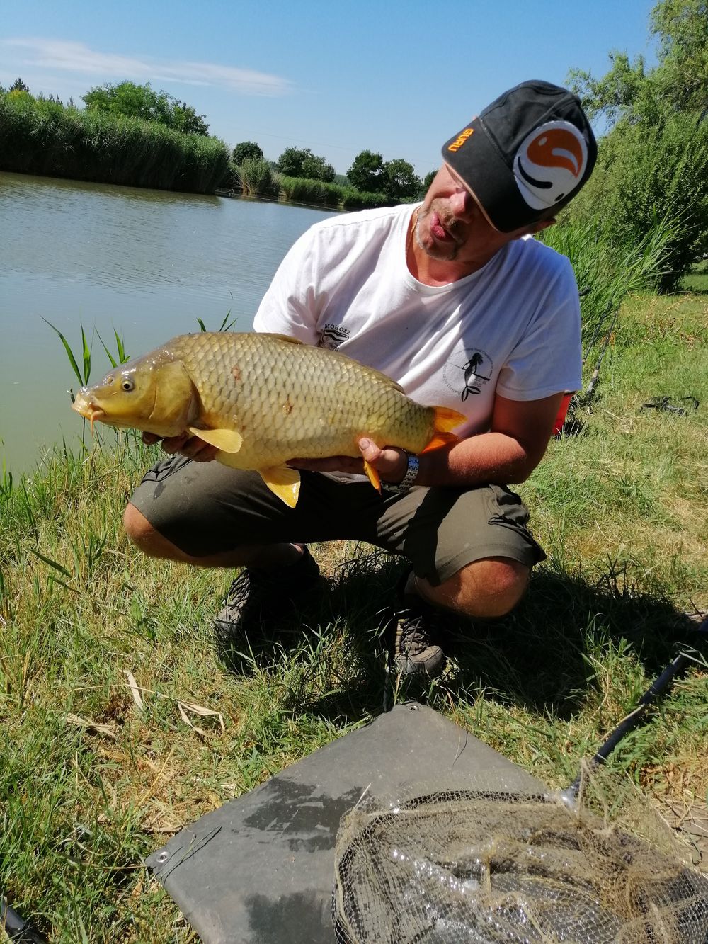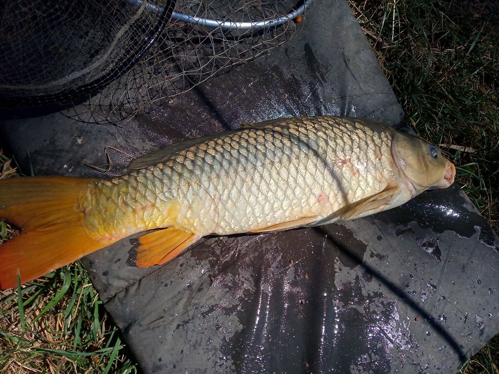 Néha átmegyek fotózni egy-egy halát Ildiknek, de mielőtt átnéznék a szomszédhoz kiengedem a féket, bár csak ide dobtam a versenyláda elé. Megbeszéljük a fogásokat, egy kis szakmai tanácskozás az etetőanyag használatának módjáról majd sétálok vissza, de úgy forog az orsó fékje hogy nem győzöm megkeresni a halat hova is vándorolt el a Daru tóba? Nevetem, mindenhogy és mindenhol kap a ponty így estefelé összepakolás közben is…
