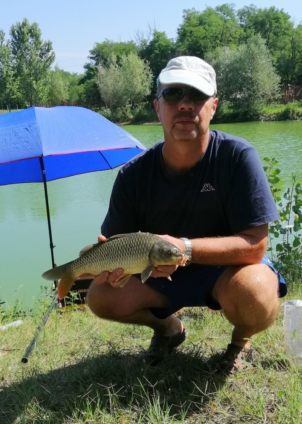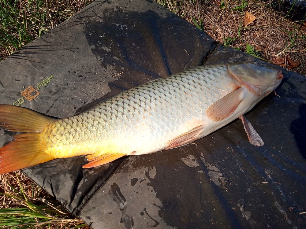 Lassan délután lesz és előbb utóbb értem jön Ildi, de még egy utolsó hajlítással elindul a víz felé a lightos feeder botom, úgy tűni a gilisztacsokor megtetszett egy jobb pontynak is… Nem én irányítok, nem is akarok hagyom vágtatni a víz alatti gőzmozdonyt, had menjen én ráérek.. Tíz perc után már közelebb van hozzám és akarnám megszákolni de a szákfej hálója elakad a víz alatti sulyomban, ugyan a hal szákolva de kivenni nem lehet… Gyors cselekvés, begázolok a vízbe és sulymostól, szákfejestől, tőpontyostól, mindent kiteszek a partra egyszerre…