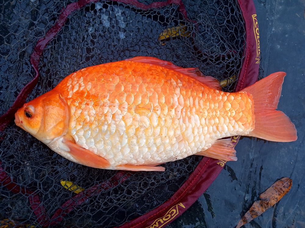 A távolabbi felszerelésemen kapás, de nem érzem nagynak a halat, csak olyan kis erőszakosnak, nem is tudom mi lehet horgon, de még a mély vízben is szinte narancsvörösben világít egy nem kicsi aranyhal!