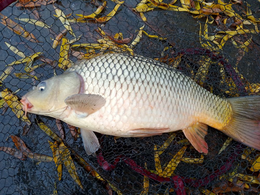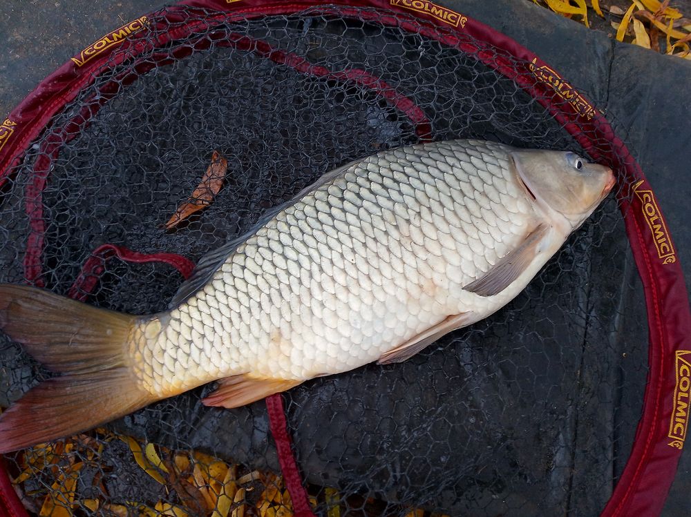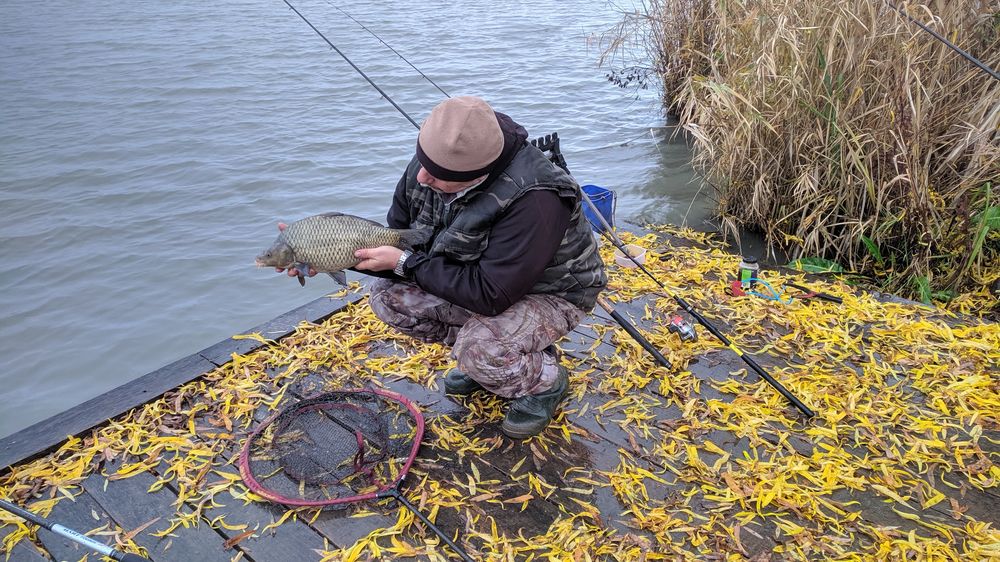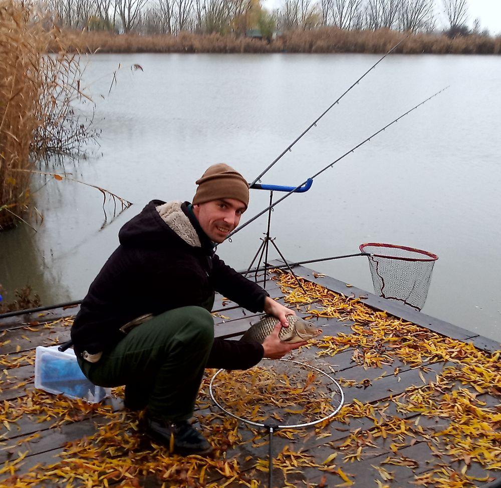 Csontira kapott hosszú előkére bár így van szerelve az egyik botom, de érintetlenek a kukacok, míg a másik methodos ínyencségekkel várja a halakat, amik aztán mégis megérkeznek és erről értesítenek engem a hajló feeder spiccek. Akkor hát fárasztás szélben és esőben, de hisz ilyenkor a horgásznak se kép, se hang nincs a fejében csak a halra figyel… A félig megfagyott kezem hamar felmelegszik és a fárasztás öröme is felpezsdít, szépen jönnek sorban a pontyok úgy látom odaállt egy csapat, elsőre egy fekete pikkelyes ponty teszi tiszteletét.