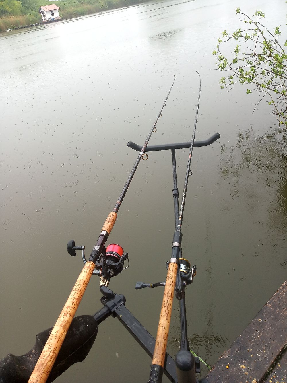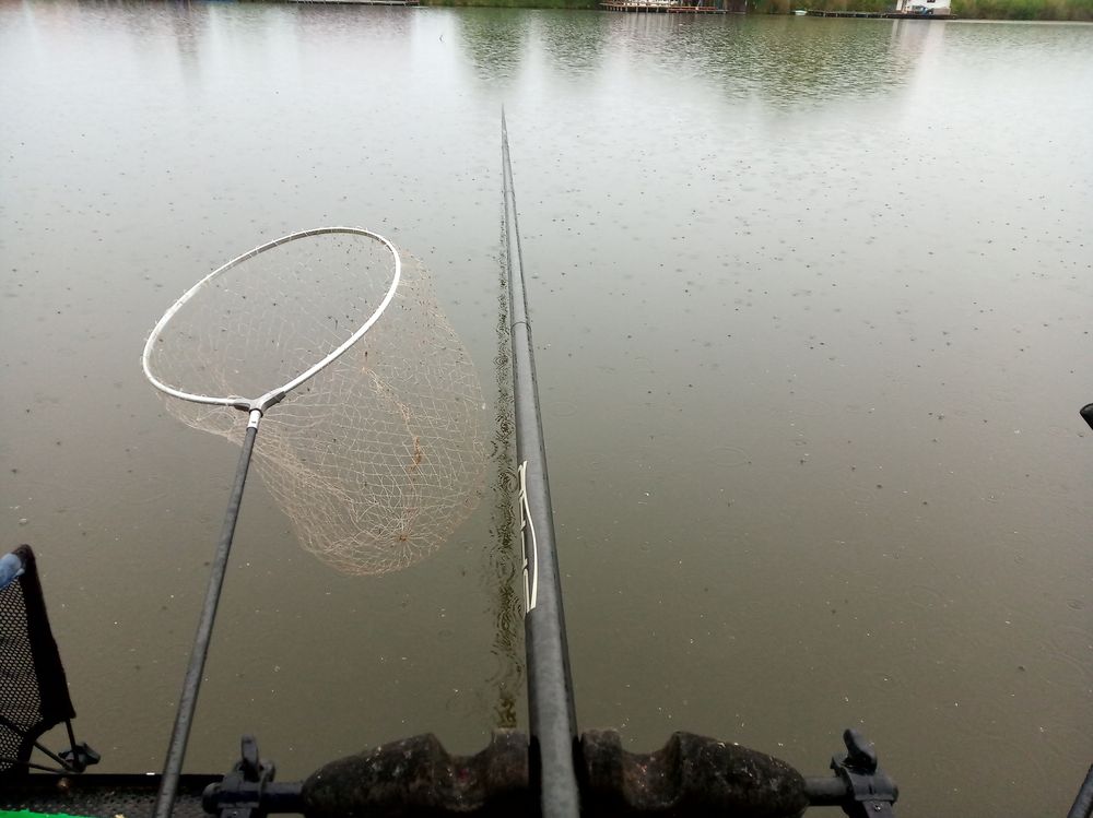 Ez pontosan ki lett számolva időre, a vízmentes nagytáskát verheti az eső a többi dolog az ernyő alatt lapul és már a rakót tolom is befelé mélységmérés céljából. Érezhetően áramlik is a víz, kicsit nagyobb úszó szükséges szokottnál, de pontyozni jöttem szóval mozdulatlan csali szükséges ma. Jobbra nádfal előtt egy komoly nehéz feeder bot tejsavas kukoricával, a rakós az pedig csemegével üzemel egyelőre. A nehéz feeder elhajlik egy pillanatra halam van, de hamar lefordul. Szidom magam azért, egy szép karcsú lightos botom ilyenkor karikába ugrik, de ez a heavy feeder leszórja a halat.