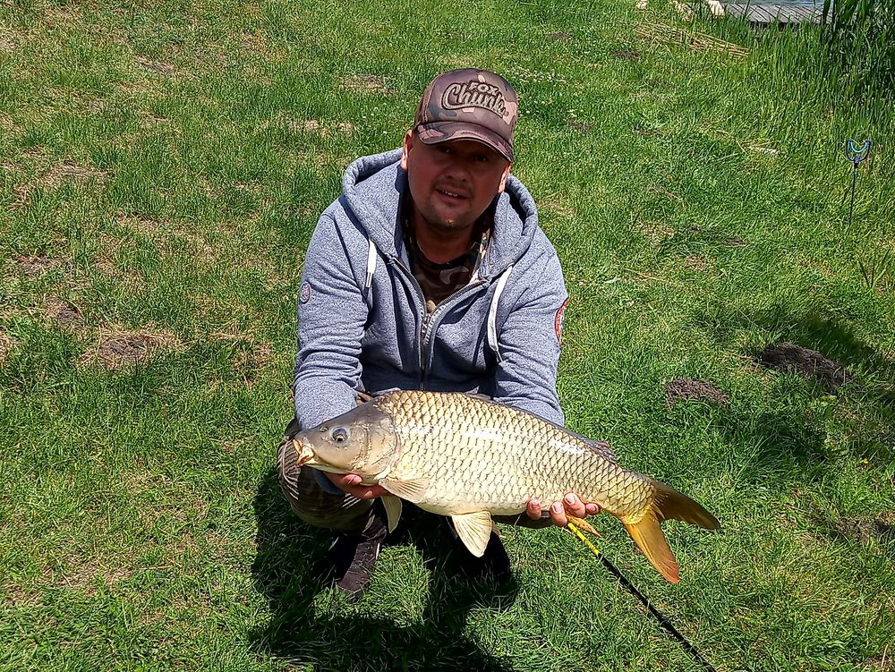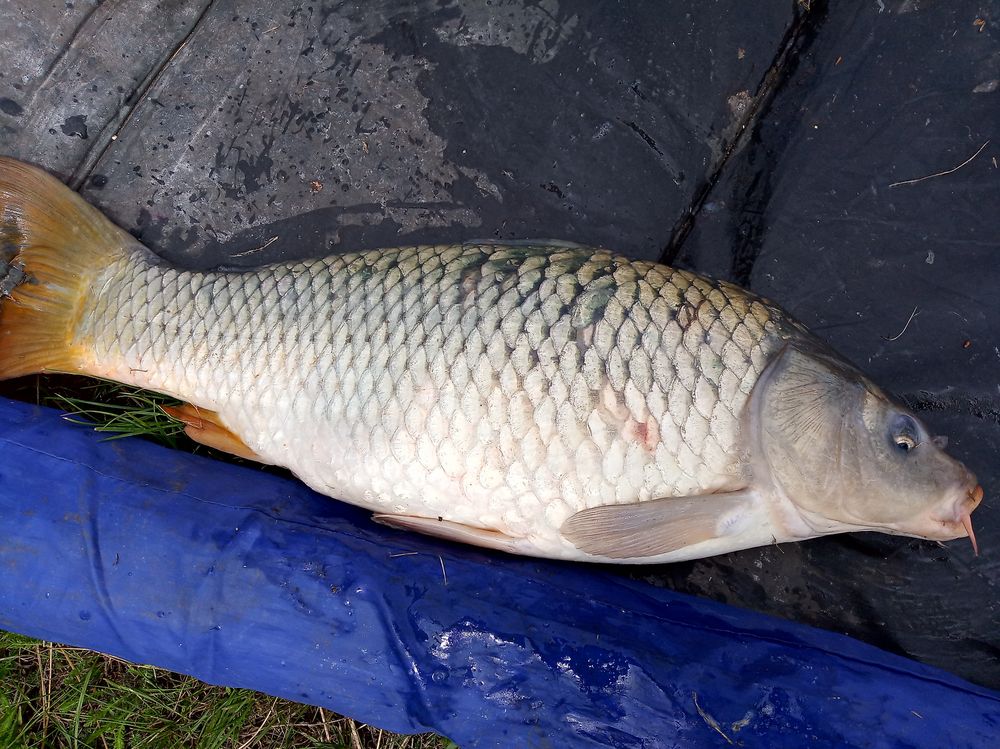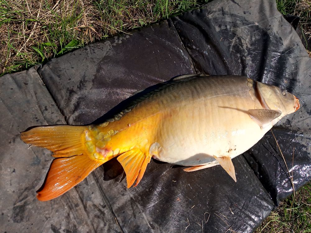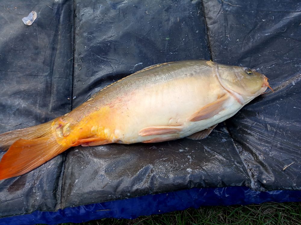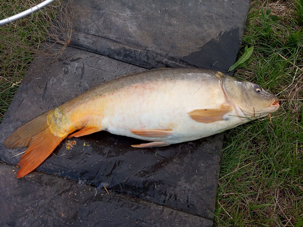 Derekas egy pikkelyes pontyot fárasztok nem adja meg magát semmi pénzért sem és lassan én fáradok, bár jobb lesz türelemmel kivárni a sokadik kört és némi levegővel megkínálni.. Úgy is van végre szákban van, egész szép pikkelyes potyeszt fogtam, jól néz ki.