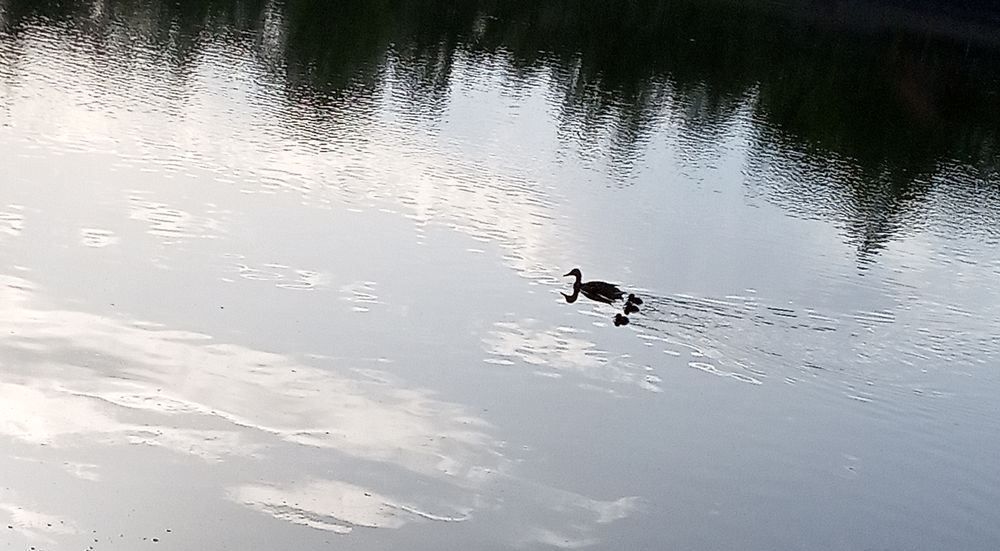 Tényleg legyen pár óra, bár most a fülledt idő kezd megfojtani, de megyek és el is foglalom a helyem. A tavacska csendben van, ugrások nincsenek front jön, front megy… Akkor csinálok egy 6 méteres parti etetést csúzlival, tejsavas erjesztésű saját kukoricával majd egyszerűen csak rádobok röviden és hagyom békében a botot, jó lesz az ott és hallom ha viszi… Azért tetszik ám amikor, a kacsacsalád felvonul nekem, három kicsi no meg az anyuka, aki aztán egész nap őrzi a népet.