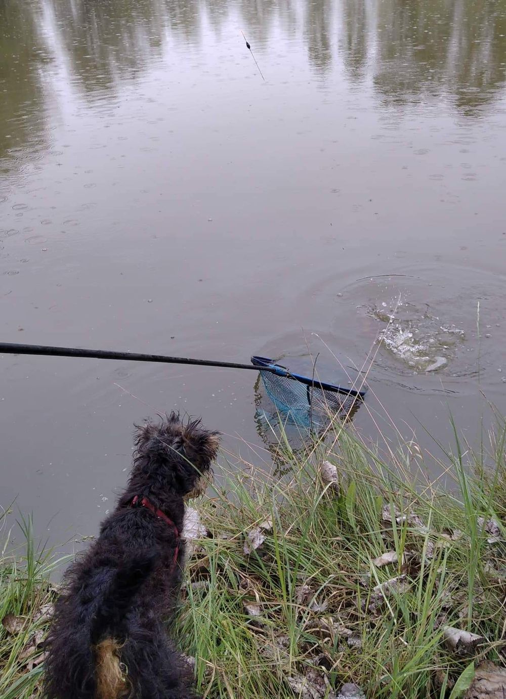 Megint egy „mindent visz” kapás és kezdődhet a fárasztás, amely kapás elkövetője egy hosszú sodrófa formájú ponty, nyurgát fárasztok és szákolok. Szép hal és örülök, hogy Tomival így át tudjuk beszélni a horgászatot, miközben esik az eső, de elférünk hárman az ernyő alatt, Tomi én és Szuszi…