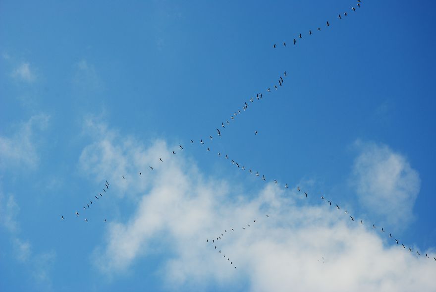 Igazi csendes néptelen part, csak négy horgász ül a parton azok is mi vagyunk, az aláfestő „zenét” a mai napra, vonuló madarak adják, szerintem több ezer vonul felettünk szép „V” betűket rajzolva. Élvezettel fotózom, ezt a természeti ösztönt, amikor jelzi nekik, hogy menni kell és igenis mennek több ezer kilométereket és épp fölöttünk van az útvonaluk.