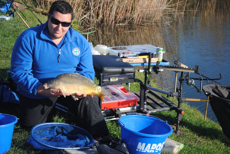 Zoli szákol és ponty piheg a kezében, egy október végi ponty, épp hogy akadt.. Gratulálok a horgásznak, aki ilyen finoman akadt apró horoggal is kifárasztotta!
