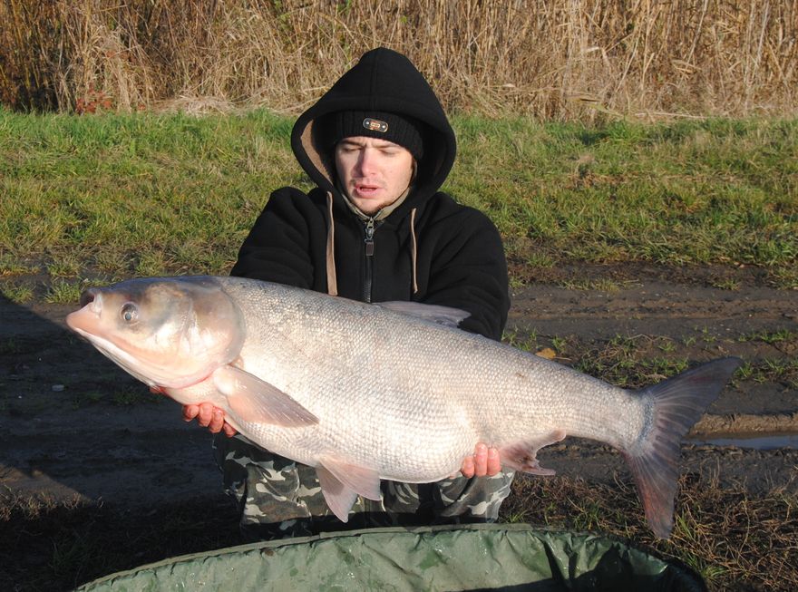Ismerős érkezik hangtalanul csónakkal, perget láthatóan sikerrel, de nem kicsi hal lehet a horgon mert tolatásra kapcsolja a villanymotort és közelít a part felé segítséget kérni! Hatalmas busába akadt a pici műcsali, csoda hogy bírja a horog. Nagy nehezen ketten kivesszük Szabival és fotózhatom a jó 20 kilós busát!!!