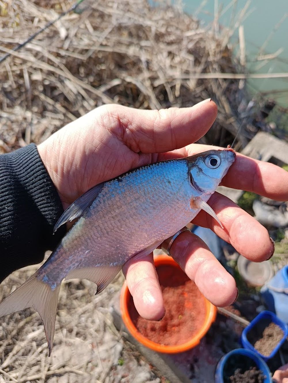 Frissítgetem a csalikat, ismétlem a bedobásokat aromázom a csalogatóanyagot egyelőre semmi. Tévedek, amíg eszek valamit olyan mintha rándult volna az egyik spicc. Közelebb megyek és figyelek, valóban van kapás csak ki kell várnom míg elhúzza és úgy is lesz, egy kis aranyos keszeg az eredmény. Olyan a hal a kezemben mint egy reményhal, szóval biztos sikerült az a műtét azt jelenti ez a kis keszeg.