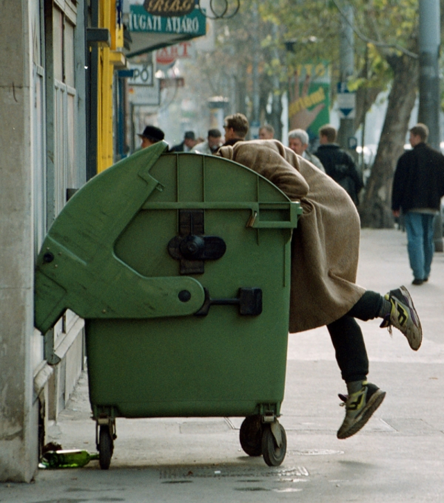 Szóval tekerek minden hajnalban, ilyenkor télen még sötét van, a 7 órai munkakezdéshez hamar kell indulni, az első lámpa vetíti a fénycsóvát biztonságosan Debrecen bicikliútján. Piros telefonfülke tűnik fel, egy emberke áll benne, a lábánál 4 szatyor az eddig összekukázott dolgok benne, talán a fülkében nincs olyan hideg, mint idekint. Feszülten figyeli a szemben lévő társasházat, pontosan hozzák ki a kukákat, hogy majd elvigyék kukásautóval. Ezt a holt időt kell kihasználni, hogy találjon kaját meg visszaváltható üveget is.